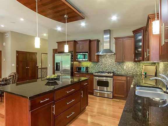 Calm retreat set in a private, wooded setting with tasteful, modern amenities & finishes. 5 bed/3 bath open, split wing, ranch plan. Kitchen boasts cherry cabinets, granite tops, glass tile backsplash, island & pantry. Large master suite with dual vanities, water closet & whirlpool tub & walk in shower with Indian Rain Forest marble surrounds. Screened porch tucked in to design for additional privacy & deck. Surround sound in LR, master bed/bath and LL. One owner. Close to schools & shopping.