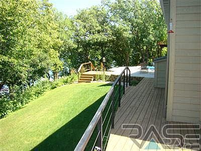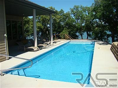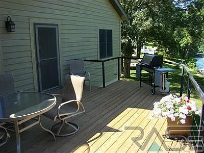 Stunning 5 bedroom, 3.5 bath, 1.5 story walkout lake home. 120' of lake frontage with private dock. Soaring ceilings in living, dining & kitchen. Full wall of windows and gas fireplace in living room with breathtaking views overlooking lake. Gourmet kitchen featuring granite countertops, maple cabinetry, large pantry, center island with built-in wine cooler, and stainless steel appliances. 4 bedrooms on the main level including the master suite with walk-in closet and private bath with jacuzzi tub, walk-in tile shower, & double vanity. Convenient main floor laundry with sink & lots of cabinetry. Abundant storage throughout. Spacious lower level walkout family room. Maple millwork & solid core doors. 2 Gibson High Efficient Furnaces each with Life Breath Heat Recovery Ventilators. Gutter Helmets on all rain gutters. Inground pool with automatic security cover. Lawn sprinkler system. Oversized double garage with floor drain. Personal Property in photos is only a representation not actual