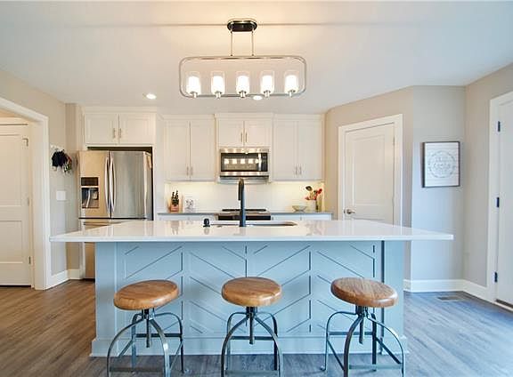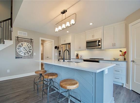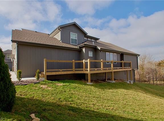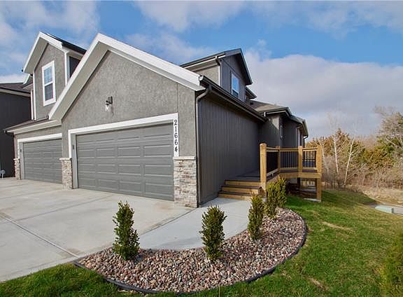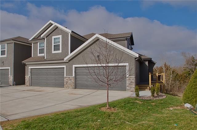 BARELY LIVED IN 1.5 STY W/AMAZING VIEW in Olathe NW school district. End unit with great side yard!! SPACIOUS & OPEN w/ soaring ceilings & wall of windows. Kitchen boasts 8ft granite island for dining and prep. Walk-in pantry, tiled backsplash and custom cabinets. Master Suite on main level w/awesome walk in shower, dbl vanity & barn door to SPACIOUS walk in closet. Laundry on main lvl and powder room. Mudroom into garage. Upper and lower decks overlooking trees and nature. BONUS LOFT! POND VIEW WITH PRIVATELY TREED SCENERY. RARE! Walkout bsmt ready for finish with GREAT space. HOA of $100/MO IS MOW AND SNOW only. END UNIT = more yard!