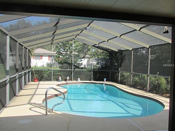 Come and look at the location. Enjoy this 2 bedroom 2 bath with beautiful large screened pool. Florida room opens to 2nd bath and to the pool. Nice size yard with landscaping. Great eat in kitchen with front corner window, plenty kitchen cabinets and pantry. 3/4"hardwood oak floors in Living room, hallway and bedrooms. Freshly painted inside. Move in condition and well maintained.