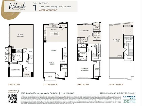 Feel one with the bay at Waterside at Alameda Marina—set right on the waterfront. These townhomes line the channel connecting Alameda to Oakland, granting full access to all of the lively Bay Area. Four spacious plans with approximately 2,189 to 2,744 square feet include rooftop decks—where you can truly nestle into and personalize to match your family’s needs.