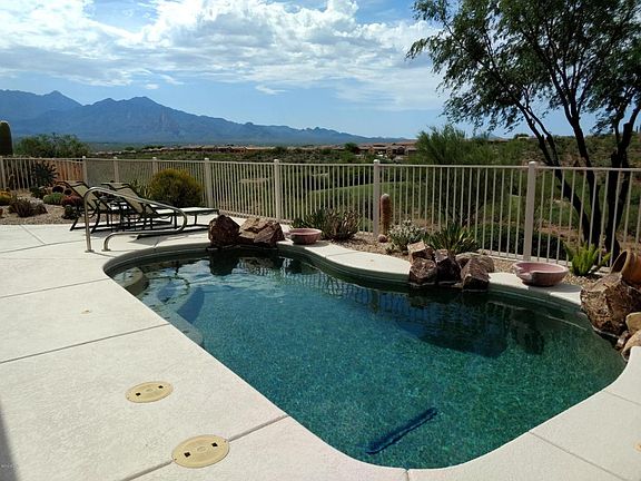Exquisite home with a small pool and 3-car garage on a premium lot overlooking the 13th Green of Canoa Ranch Golf. Located in Canoa Northwest, a 55+ gated golf course community in scenic Green Valley. Magnificent mountain views! Courtyard and security gated entry. Travertine flooring throughout. Wrought iron and glass double doors to Office with built-in desks and cabinetry. Formal Living/Dining Room. Custom designed and crafted contemporary cabinetry. Gas beehive fireplace in Family Room. Beautiful granite countertops. Luxury resort quality Master Bath. Addl Pantry room. Epoxy garage floor, cabinets & side door. South facing covered patio, sun deck and built-in BBQ. Nicely landscaped with colorful, low care desert plants. GVR membership required. Very well maintained, exceptional home.
