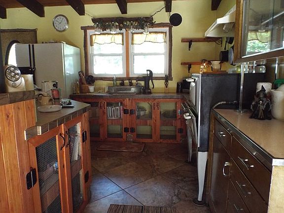 Privacy and nature surrounds this updated home. Custom kitchen cabinets wood trim and slate floors are made from resources on the property. Come take a look.