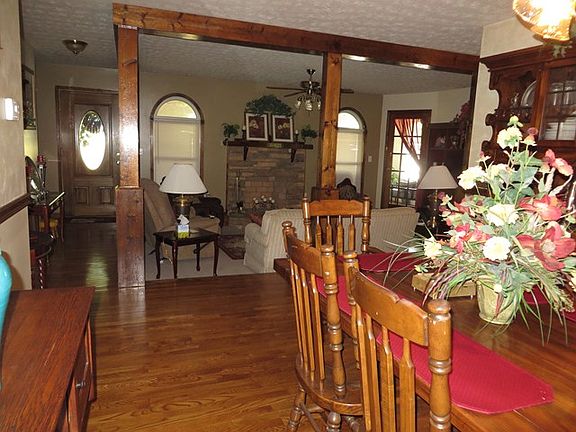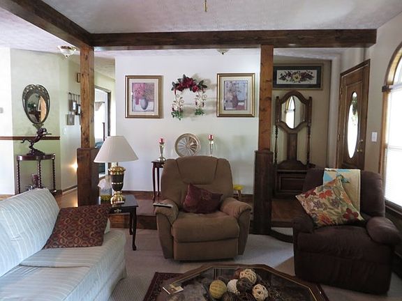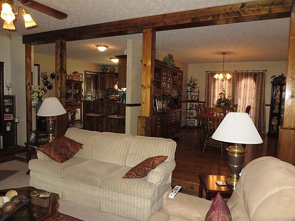 Unique property on 1.95 acres - Open floor plan with foyer entrance; family room w/ masonry fireplace; separate dining room; eat in kitchen w/bar - 2 bedrooms and 2 baths - sun room - basement with 4 partially finished rooms. half bath and heated with wood burning stove - deck on back - workshop - storage building