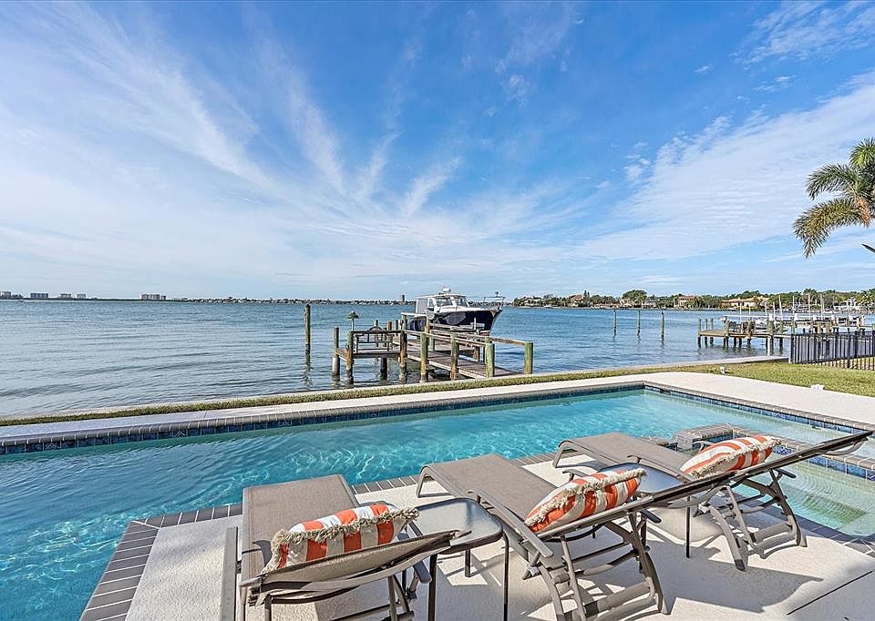 Unrivaled location, breathtaking views, and ideal water access combine with an impeccably constructed and maintained home to offer one of the finest bayfront opportunities in Sarasota today. This clean-lined coastal style home is ideally situated West of Trail in the beloved Paradise Shores neighborhood, between Harbor Acres to the north and Cherokee Park to the south. Custom built for enjoying a gracious waterfront lifestyle, the elevated four bedroom, four bathroom home is designed around panoramic west-facing sunset views that rival those of a penthouse condo. It is also built to last, atop 18 stout, poured concrete pilings dug deep into the earth. Ascend the front steps to a classic Florida front porch, spanning the width of the facade and beckoning guests inside. The creamy white clapboard exterior flows seamlessly with the soothing neutral palette inside that puts the views at center stage. Wide open vistas and abundant natural light steal the first impression, but the thoughtfully arranged interior spaces soon snap into focus. The interiors are defined by restrained style and timeless appeal. Generous open-concept public rooms and ample outdoor decks offer effortless entertaining. The double-island kitchen features a hidden walk-in pantry, a built-in dining banquette, and quality appliances including Wolf double ovens, Miele dishwasher, and Bosch gas cooktop. A main floor owners' suite provides peaceful respite, including a private deck for morning coffee or yoga, while dual home office spaces cater to today’s work-life balance. Smart touches like a dumbwaiter to the garage level and a laundry chute from above offer unexpected convenience. Upstairs, three large bedrooms, each with spacious walk-in closets and big water views, encircle a lofted bonus room overlooking the great room below and the bay beyond. A secondary laundry area on the upper floor is ideal for families or guests. Down below, the garage level offers conditioned storage space and a home gym, parking for 5+ cars, and vast, versatile unfinished recreation space limited only by your imagination. Vintage mid century modern glass doors (salvaged from the original home that previously stood on this site) roll up to reveal a back yard oasis, featuring a saltwater pool and spa stretched along the bay, 100’ of water frontage, and a newer dock with 16,000 lb. boat lift. Boaters take note: few mainland properties combine deep water dockage just off your seawall with immediate access to Big Pass and open water without any bridges, canals, or no wake zones in your path. Enjoy your tropical paradise and rest easy knowing that elevated concrete block construction and a whole-home natural gas generator will help you weather any storm. Paradise Shores is an easy walk to the restaurants and shops of Southside Village and a quick drive from downtown, but despite this proximity, the neighborhood still manages to feel tucked away, a hidden gem sparkling on the bay. Endless views, unrivaled boating, and gracious living await.