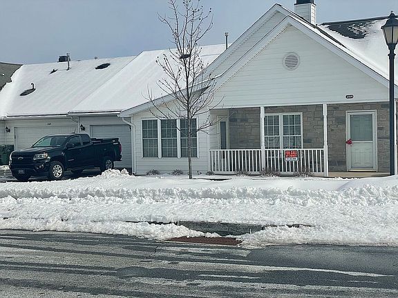 Villas on the Lake condo! Beautiful cathedral ceilings in living room and upstairs bedroom. Lots of windows for loads of natural light. All neutral walls, light beige carpet in rooms except for kitchen and bathrooms. Gas fireplace with fan in den. Both the tub and shower units are seamless one piece. Glass sliding shower doors from the master bath shower are available to reinstall. New AC/furnace in 2015. New microwave and chair height commode in master bath 2019. New roof coming in few years by condo association. Covered full front porch, all season sunroom, oversized garage with storage above and all Maytag appliances. Excellent area for walking, short drive to everything, landscaping and snow removal by condo contractor.