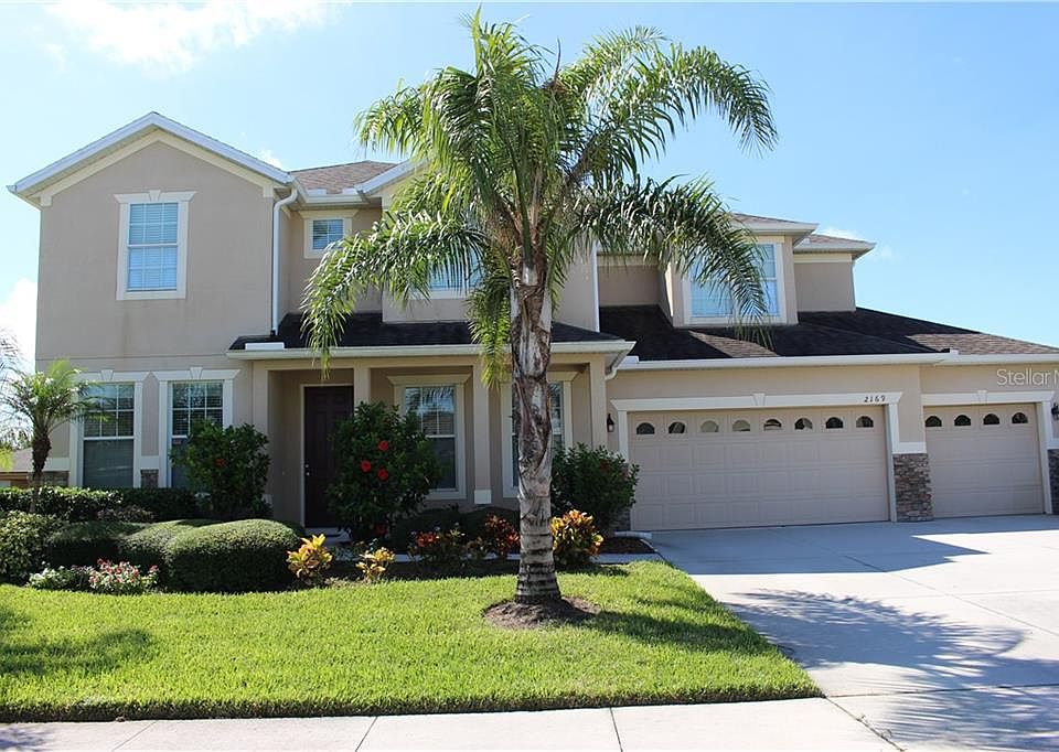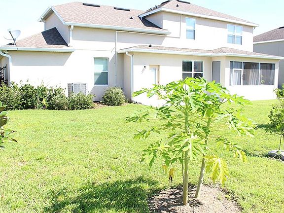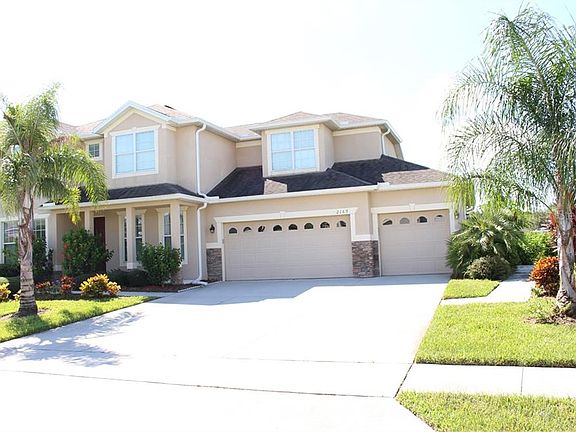 This beautiful two story 5 bedroom, 3 bath with oversize 3 car garage was a former model home (Cypress Garden Floor Plan) with lots of upgrades by the builder . After entering the foyer ,the formal dining room is located to one side while the formal living room is on the other. As you walk through the hallway you will see a beautiful railing staircase leading up to the second floor. Its large kitchen with breakfast nook area, has 42 inch cabinets, stainless steel appliances, decorative backsplash, recessed and pendant lights, granite countertops with island bar overlooking into the Family room that leads into a covered screened lanai. This open-concept is perfect for entertaining. The first floor also includes a guest bedroom and a full bathroom. The second story of the home features a large Owners Suite with 2 walk-in closets and spacious owners bathroom with granite countertop dual sink vanity, oversized tiled shower and separate garden tub. There is three additional bedrooms upstairs with a full size bathroom which is great for a large family. Brand New AC system installed July 2020. There is a storage room containing a water softener system. Custom features include window treatments, tray ceiling with crown molding. Outdoor range, fridge and freezer in garage is not included with sale of the property. Don't miss this opportunity to make this your dream home!