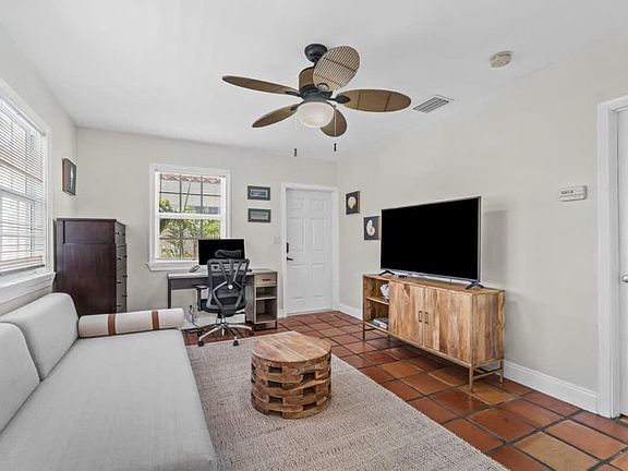 Welcome to Miramar Villa, an exclusive retreat just a few minutes' drive from Downtown Palm Beach and the pristine beaches of Singer Island. This 2100 sq ft haven features a spacious main house with 3 bedrooms and 2 bathrooms, complemented by a well-appointed guest house with a kitchenette and full bath. Enjoy a beautiful day on the patio with a heated pool, grill, and ample lounging options amidst tropical landscaping. Located steps from the Intracoastal and Currie Park, Miramar Villa blends chic comfort with unparalleled access to West Palm Beach's finest attractions. This villa offers a fully equipped chef's kitchen, luxury linens, and premium bath products, ensuring a comfortable and luxurious stay. The living space is designed for relaxation and enjoyment, with high-speed Wi-Fi and dedicated workspaces for those who need to work from home. Pets are welcome at this property for an additional $150 fee. The carport and driveway can accommodate up to 4 vehicles, providing ample parking space. Situated near Rybovich Super Yacht Marina, Rosemary Square in downtown West Palm Beach, and the white sandy beaches of Palm Beach and Singer Island, this beautiful escape provides easy access to The Breakers, City Place, Clematis on the waterway, and the Kravis Center in the eclectic downtown Northwood. Landscaping, pool company, and pest control maintain a regular schedule. Pool heating is complimentary during colder temperatures. Smoking is not allowed anywhere on the property, indoors or outdoors, and will result in an odor removal fee of no less than $500 and up to $1,000, as well as possible removal from the property. For stays of 60 nights or longer, a full mid-stay cleaning is required every 30 days, with the fee invoiced prior to the service. Includes high-speed Wi-Fi and dedicated workspaces, making it ideal for remote work.