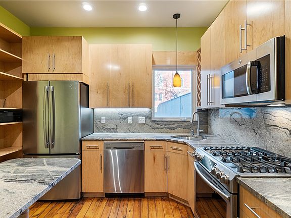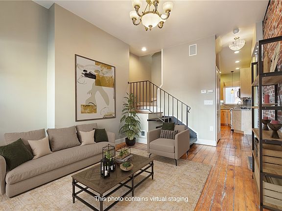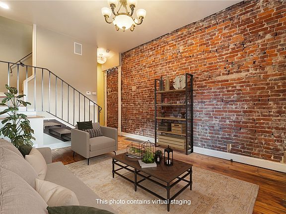 Discover the allure of urban living in this timeless Lawrenceville row house, located just one block from Butler St. This stylish home offers 2 bedrooms, 2.5 bathrooms, and a host of modern amenities for a convenient lifestyle. Upon entrance, the exposed brickwork and pine flooring add a touch of warmth to this classic space. The thoughtfully designed modern kitchen shines with custom maple cabinetry, granite countertops, and guest powder room. The floating industrial staircase leads to the second floor, which features two bedrooms and sleek hallway bathroom. The basement living space is a versatile area, complete with a full bathroom and access to the rear courtyard. Additionally, a finished third floor provides an ideal space for a home office or dressing room, catering to a variety of lifestyle needs. Whether you seek a smart investment or a place to call home, this property is a casual blend of style and practicality.