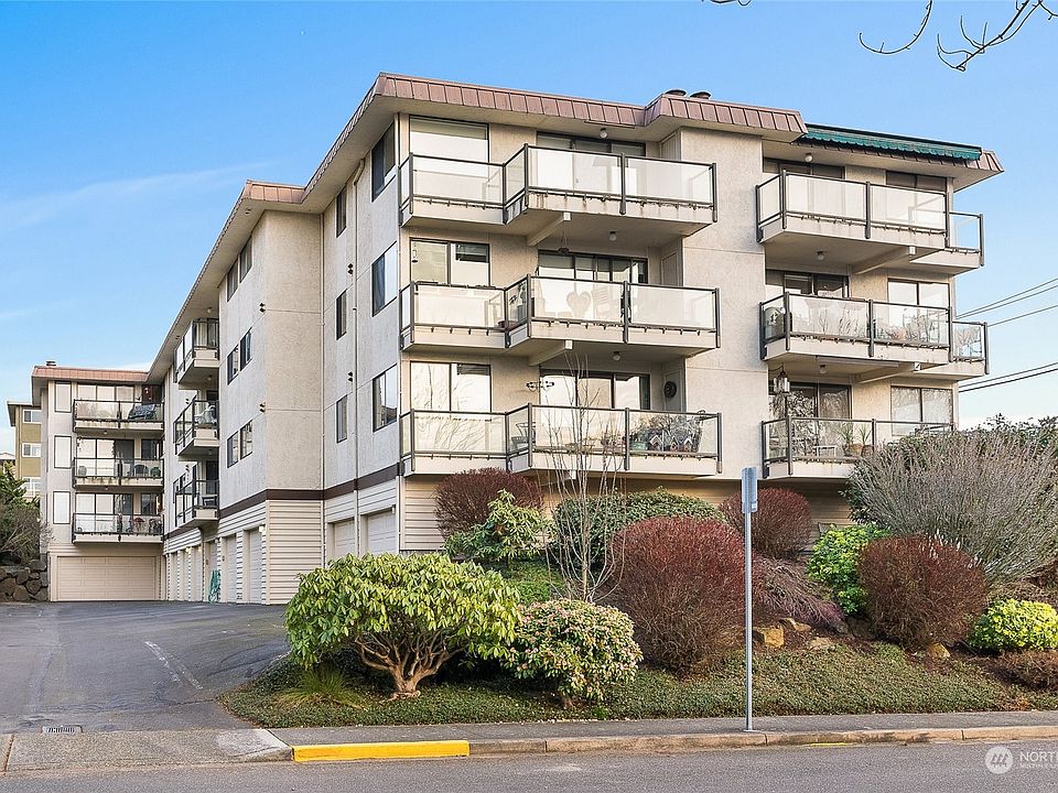 Wonderful opportunity in a 55+ condominium community located in the heart of the city. This spacious 2 bedroom, 1.75 bath light-filled unit is ready for its new owner. Cozy up with your corner fireplace on those chilly nights or open your door to the large balcony & enjoy the fresh air, mountain and sound views. Separate two car garage. Minutes to all that downtown Edmonds has to offer: waterfront parks, grocery store, restaurants, shopping, cafes, beach, ferry and so much more. The building has an elevator, secured lobby foyer, garden area, and versatile common room. Home is virtually staged. This is definitely a must-see!