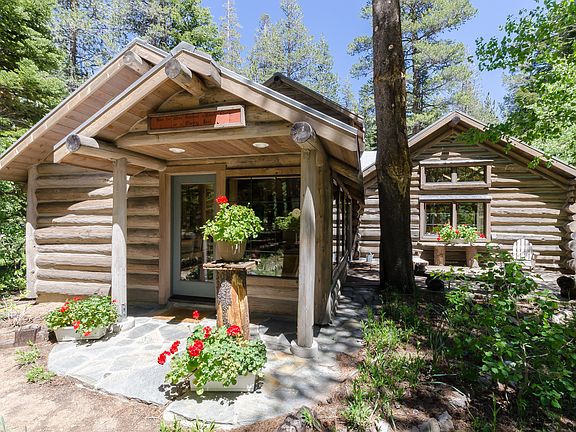 This authentic 2-bedroom + Office + Bonus Rooms, 2-bath log-home-in-the-woods is truly in a category of one. Located in the heart of Old Mammoth, the historic cabin built in the early 1920s is now the homes Great Room. Use of original reclaimed materials throughout the solidly constructed residence on a full concrete foundation enhances its unique character. Private yet central, cozy yet spacious, move-in ready – there’s not another home like this in the Eastern Sierra. South-facing bright cheery kitchen has skylights and plenty of windows offering views to tall pines. Double glass doors lead out to a large sundeck. Great Room has a vaulted ceiling with skylights, rugged log trusses, an ultra-efficient wood stove and an adjacent sunny office/bonus room. Surrounded by over 3/4 of an acre of aspen and pine and with Mammoth Creek across the lane, this home has a serene, soothing energy. While it has all the modern conveniences and is conveniently located to town, the historical ambience makes it an incomparably special place – a place you just don’t want to leave! In the peaceful, 2nd-floor master bedroom with en-suite bathroom, drift off to sleep listening to the quintessential alpine lullaby – the breeze in the trees and nearby rushing creek. A 2nd bedroom on the 1st floor is adjacent to a brand-new bathroom with Drake-milled logs framing an over-sized, custom shower. The laundry room is on the main floor, as are two walk-in pantries/store rooms. Tremendous storage capacity is available in the spacious 2-car garage. A large insulated workshop is located on the 1st floor of the garage, paradise for the carpenter or perfect for a bike/ski tuning center. On the 2nd floor of the garage is a light-filled, 240 sq ft private bonus room with south-facing windows.