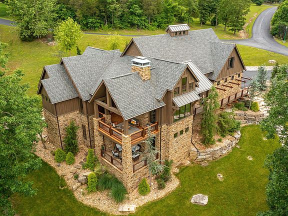 At no fault of home or seller this beautiful home is back on the market. Inspections have been conducted and this home is ready for its next owner! Saddlebrooke at its finest! This luxurious modern-rustic design sits in the heart of one of the most elite communities in all of Southwest Missouri. This 3.6 Acre Ozark Mountain Masterpiece was built with attention to all detail. Iron, steel, stone and wood all come together to create a breathtaking work of art that is sure to please the cabin lover and modern appeal of all that enter. Large beam work, natural flagstone, industrial touches, rough cut hardwood flooring, butcherblock style stairs, elaborate landscaping and amazing views make this the benchmark for what you expect when you think of Saddlebrooke! This 4 bed 4 bath home is designed with privacy in mind. The main level is set with an open floorplan design which includes a spacious kitchen, hearth room, living room, 1/2 bath and a beautiful master with well acquainted full bath that include a walk-in shower and large soaker tub. The upper level has an oversized ensuite bedroom and office space, while the lower level contains 2 additional bedrooms, a billiard area, 2nd living area and state of the art theater room for all of your entertaining needs. Enjoy watching the wildlife drink from your wet-weather creek from your covered deck and you will feel like you're in the middle of Colorado! The 3 car garage is perfect for the car lover with lots of room, great ceiling height and epoxy flooring. Within Saddlebrooke, you'll fall in love with over 2500 acres of winding creeks, deep valleys, mountain vistas, and the clear waters of Bull Creek seen throughout the community. The Association offers a community building, meeting rooms, swimming pool, tennis and pickle ball courts, pavilions and several parks that access Bull Creek. This is the perfect package and is the Mountain Modern Home that is the envy of all of Saddlebrooke