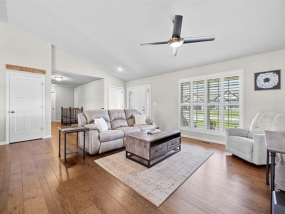 Welcome home to this BEAUTIFULLY maintained 2.5-year-old ranch that effortlessly blends modern comfort with timeless elegance. This 4-bed, 3-bath home offers a spacious, open-concept living with upscale finishes throughout. As you enter you will love the gorgeous engineered wood floors flowing through the main living area, complemented by elegant plantation shutters & abundant natural light. The gourmet kitchen is a chef’s dream, featuring a large center island, gorgeous granite countertops, sleek stainless steel appliances, ample cabinetry, custom backsplash & a functional layout perfect for entertaining. The finished lower level is a dream providing additional living space—ideal for a media room, home gym, or guest suite. Step outside to your custom covered patio, a perfect retreat for relaxing or entertaining year-round. The professionally installed irrigation system keeps the lush landscaping pristine with minimal effort. We have to mention the finished 3-car garage complete with cabinets for storage. Don’t miss the chance to own this better-than-new ranch that’s move-in ready! It's time you LOVE WHERE YOU LIVE.