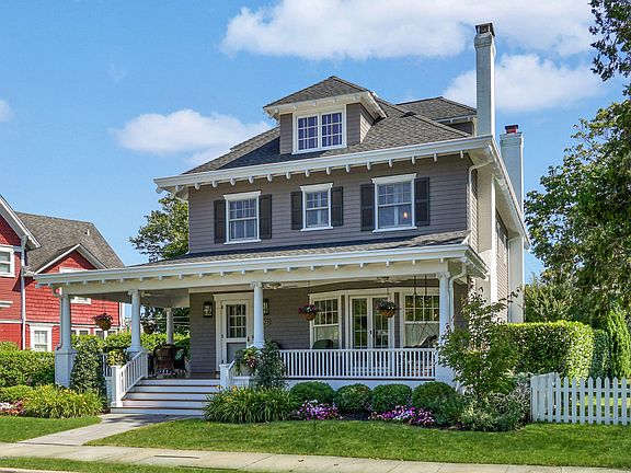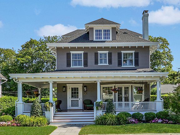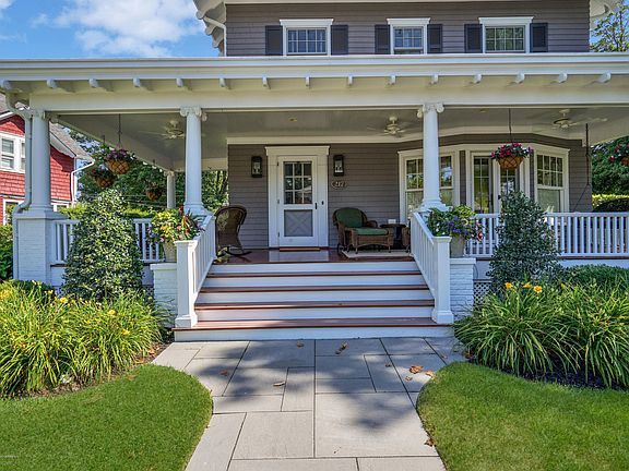 This quintessential Sea Shore Colonial with mahogany wrap around porch is a Spring Lake Classic . Enter into a warm and welcoming entrance foyer with pocket French doors that lead to a bright and sunny Dining room with a unique gas fireplace. The gourmet kitchens is truly a chef's delight! Fam room has Large French sliders overlooking beautiful English gardens. In addition, there is a mud room and 1/2 bath. The second floor lead into a Master suite with sitting room, built in desk area separated by pocket doors opening to Master bedroom with Juliet balcony and French sliders. Additionally, there are 2 ensuite bedrooms. The third floor has an additional 2 bedrooms, full bath and plenty of storage. The basement is finished with large recreation room and additional 2 rooms, a laundry room .