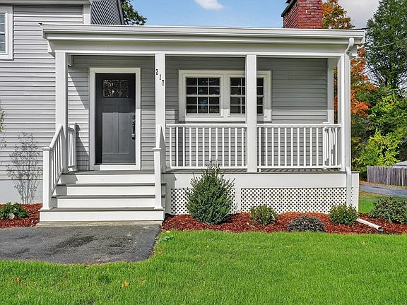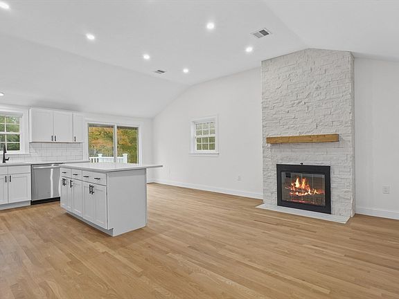 White stone fireplaceTiled showerFront porchComposite deckCathedral ceilingNew drivewayNew windows