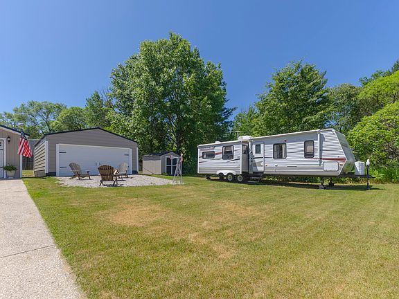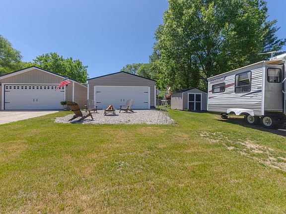This stunning home has been thoughtfully updated throughout and is move-in ready! Featuring an open concept design with gleaming hardwood floors, recessed lighting, crown molding, and newer windows, every detail has been carefully considered for comfort and style. Enjoy cooking in the spacious kitchen, which boasts newer appliances, countertops, sink, and modern flooring. Step outside to a fully landscaped yard perfect for relaxing or entertaining. Additional highlights include new metal roofs on all structures, two detached 2-car garages and a large storage shed for all your extras. Conveniently located close to the lake and just minutes from town, this property offers both tranquility and accessibility. As an added bonus, the RV onsite is included in the sale. Perfect for extra company