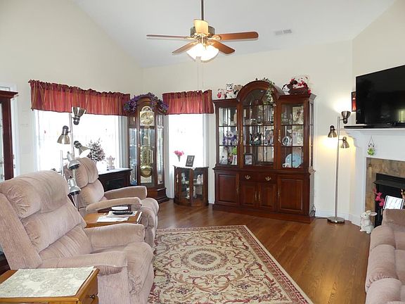 Spacious two bedroom, two bathroom home. Laminate and carpet floors. Double garage with storage room. Open floor plan. Shades on front porch remain.
