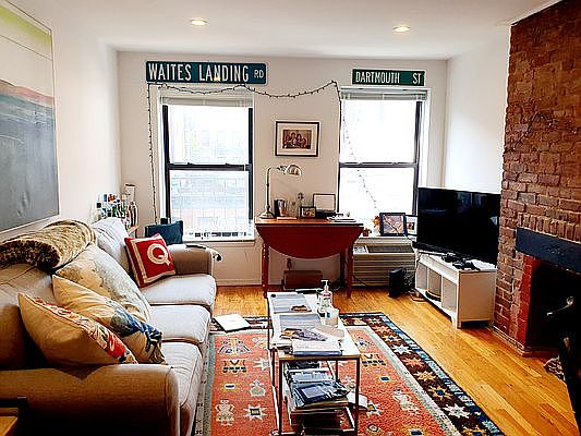 This is an enormous 1BR Floor-through apt that extends the entire length of the building (50 ft long!) Broker fee apt available 4/1 * Gorgeous natural light * South facing - no building obstruction * Enormous bedroom, can easily fit a KING sized bed with plenty of furniture * Loads of closet space * Exposed brick wall * Decorative Fireplace * Recessed lighting * Dishwasher * Laundry room in building complex. * 4 flights up, top floor - no noise from above * In person showings only * Email only for showings * No pets * Broker fee