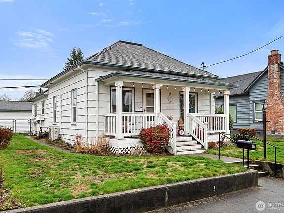 Adorable curb appeal with inviting front porch leads into this well-maintained 1910 home featuring original details, including panel doors with vintage hardware, hardwood floors, and built-in cupboards. The interior layout features a spacious living room, a large kitchen with an eating space, a full bath, and three generously sized bedrooms. Updates include electrical, a newer roof, double-pane windows, ductless mini-split for year-round comfort, a newer water heater, and exterior paint. Detached 2-car garage with shop space. Can't beat this location, close to downtown Arlington, Centennial Trail, parks, and area amenities!