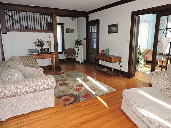 Step inside this beautiful prairie style home and you will feel you are at home to stay! Featuring hardwood floors throughout most of the main floor along with a gorgeous open staircase and crown molding. This home boasts a formal dining room, living room, family room, and a bonus four seasons room. Family room has a natural fireplace with built-ins. Upstairs you will find the large master bedroom with big walk-in closet, vanity w/ sink and a private outside deck. Newer windows. Steel siding. Private patio outside with stamped concrete and a pergola, plus a fenced-in yard. A tuck-under garage completes this home. Close to library, farmers market, and downtown shopping. Property is in central business district so a business is a possibility. This one won't last long, so hurry!