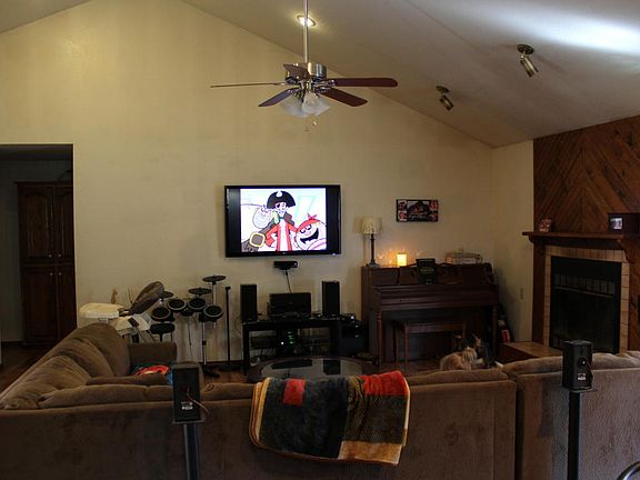 Several recent improvements, paint, flooring, heat pump, glass sliding doors & more. Total electric home with wood burning fireplace. Huge kitchen with lots of cabinets, pantry and breakfast bar. Screened porch off living area overlooks deep back yard with newer chain link fencing. All appliances stay including the washer and dryer.