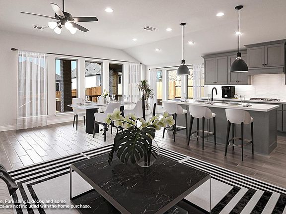 READY FOR MOVE-IN! Welcoming front porch opens into an extended entryway adorned with 12-foot ceilings. French doors open into the private home office, located just off the entrance. Down the hallway, you will find the secondary bedrooms, each featuring walk-in closets and a shared full bathroom. Adjacent to the hallway, French doors open into the inviting game room, complete with three large windows. The open family room, featuring a wall of windows, seamlessly leads into the designated dining area. The corner kitchen boasts an inviting island with built-in seating and a walk-in pantry. Entering the primary bedroom, you are greeted with ample natural light from the three large windows. French doors lead into the primary suite, showcasing dual vanities, a garden tub, a glass enclosed shower, and two walk-in closets. A guest suite with a walk-in closet and private full bathroom is located off the main hallway. The utility room with an included linen closet is conveniently located adjacent to the game room. Outside includes an extended covered backyard patio. Completing the home is a two-car garage.