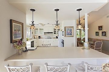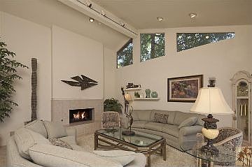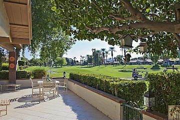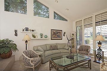 Rarely available 3000 Max Plan with beautiful private sideyard in one of Monterey Country Club's most spectacular locations. Not only does this one-of-a-kind home enjoy southern golf course, lake and mountain views, it is also the club's ONLY free standing, unattached unit! The home features two bedrooms, a huge den/office and three large baths. The den/office could easily be converted back to a third bedroom and, like the other bedrooms, has its own bath. Updates include a large extended and tiled patio, double sided fireplace, plantation shutters, ceiling fans, recessed lighting, solid surface countertops, undercabinet lighting in the kitchen and tile flooring in all traffic areas. The kitchen has also been opened to the great room and a breakfast counter has been added. The home's private sideyard can be accessed from the dining room and both bedrooms. The sideyard features lovely landscaping and your own citrus grove. A community pool and spa is directly across the street.