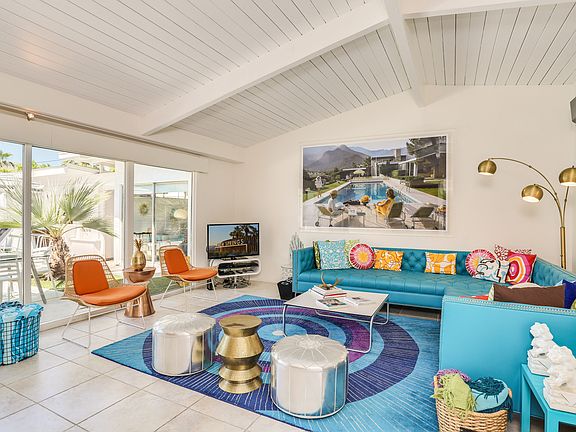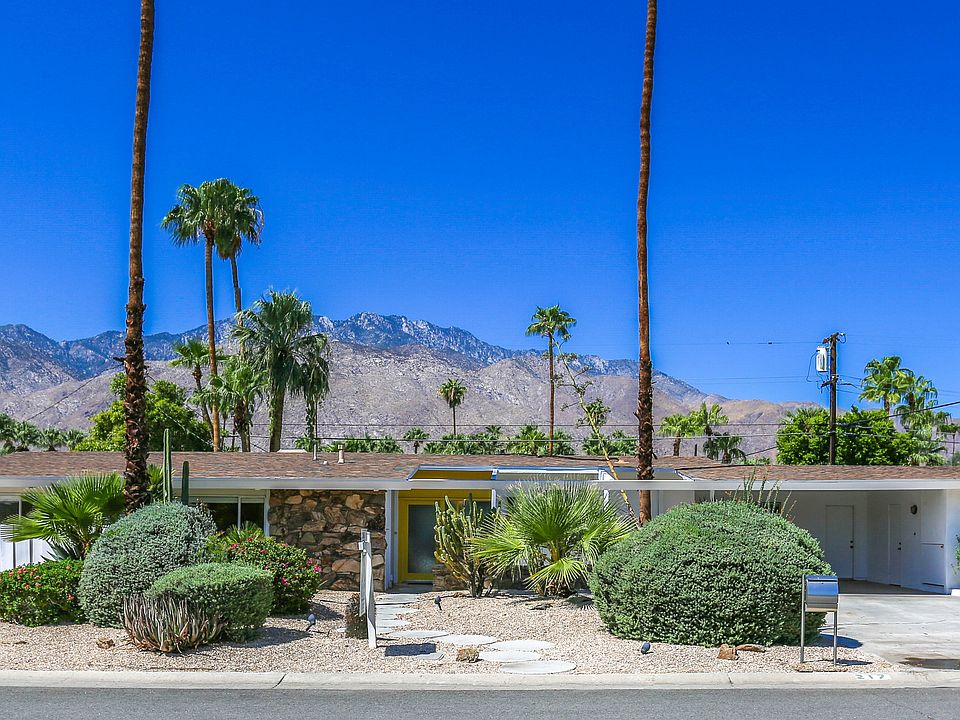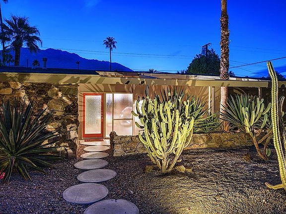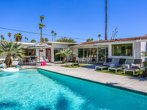 1958 ALEXANDER CLASSIC located in the popular MCM Palm Springs neighborhood of SUNRISE PARK! The Alexander Construction Company used this as a model home for their Enchanted Homes II subdivision. All builder additions + upgrades were incorporated including the breakfast room. Vaulted ceilings, post + beam construction & walls of glass! In addition to the 3BR, 2BA main house, there is a casita + full bath. Sharing the same bath is a home office / 5th bedroom. Steps away, enjoy the Tiki Bar + outdoor kitchen, pool + spa, ping-pong area, fire pit, outdoor shower & panoramic mountain views to the West! Neighbors say the Alexander family stayed here for a few years while building their Vista Las Palmas home. In 1960, the family purchased the town's famed Desert Inn. An original neon sign from the Inn has been hanging over the tiki bar since the 1960s. The house has been remodeled to maximize its modernist roots and has been used as a successful vacation rental in the past. Notable recent upgrades include double-pane windows, updated plumbing, energy efficient 5'' foam roof, quartz counters, tile floors, window treatments which remain consistent throughout, outdoor shower, new electrical meter. Hot tub installed in 2021. Experience the MAGIC of an Alexander unlike any other!