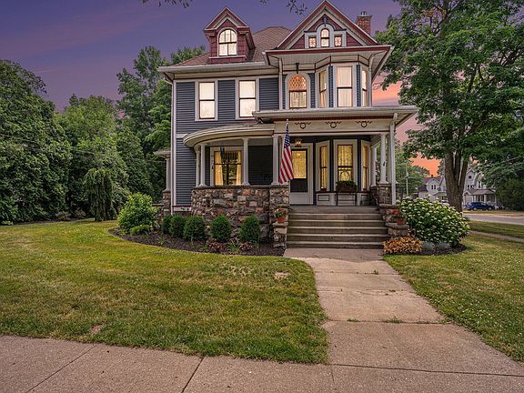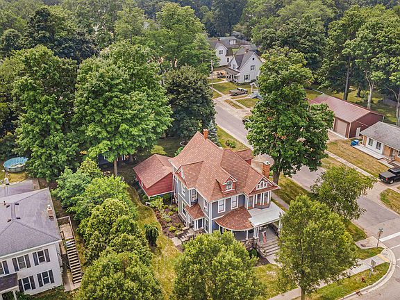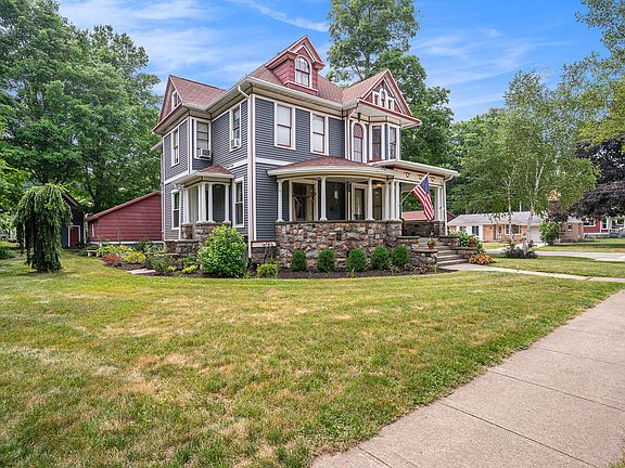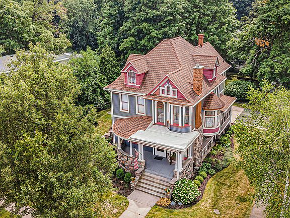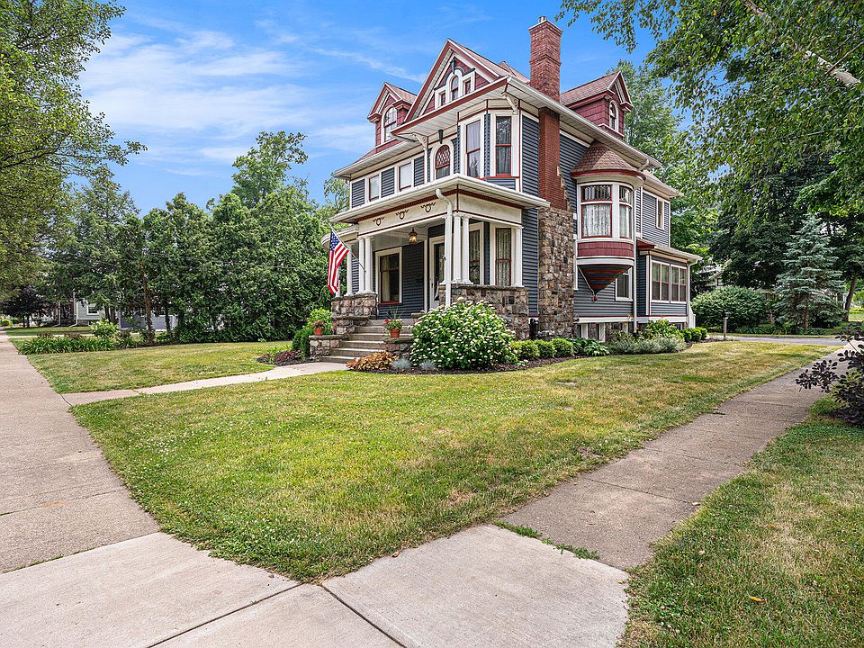 Do not miss this beautiful Victorian with an abundance of character. Want to have coffee on the front porch or cozy up to the fireplace; you can do both. Built around 1900 this home features original woodwork in beautiful condition, including pocket doors. Antique fireplace recently converted to gas with new surround, beveled glass windows, beautiful curved window in staircase. Built in cupboards that open into dining room and butler's pantry currently being used as a coffee bar. Parquet and wood floors, 2 car attached garage. The original carriage house is currently being used for storage although the possibilities are endless. Newer gutters and roof, furnace (2021) and upgraded electrical, plumbing, new double hung windows from Bee Windows (2021/2022) in most of downstairs. Plaster was resurfaced on majority of the walls and ceilings.
