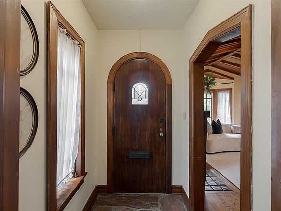 Nestled in the heart of Historic Edgemere Park, this classic two-bedroom, one-and-a-half-bath bungalow blends timeless charm with thoughtful updates. Just steps away from the scenic green spaces and walking trails of Edgemere Park itself, this home offers a lifestyle rooted in community and character. The living room welcomes you with vaulted wood-beamed ceilings and a rich stone fireplace that sets a warm, inviting tone. The adjacent formal dining room is bathed in natural light from large multi-pane windows and showcases original hardwood floors and detailed trim. The kitchen has been beautifully updated with granite countertops, a tiled backsplash and warm oak cabinetry. A cozy breakfast nook, framed by an arched entryway and surrounded by windows, creates the perfect spot for casual dining. The full bathroom has been completely remodeled with floor-to-ceiling marble tile, a frameless glass walk-in shower with bench seating, designer lighting, built-in wood shelves and a custom vanity topped with quartz—creating a luxurious, spa-like retreat. Curb appeal abounds with classic Tudor-style architecture, mature landscaping, a stone-paved front porch and charming arched front door. The long private drive leads to a 2-car detached garage (sold as-is), offering added convenience and potential. The backyard is a private oasis with a mix of green lawn, vibrant flower beds, tall shade trees, hot tub and a custom iron gate—ideal for relaxing, entertaining, or gardening. Lamp post as-is. This home offers timeless character, modern comfort and a coveted location in one of Oklahoma City's most beloved historic neighborhoods.