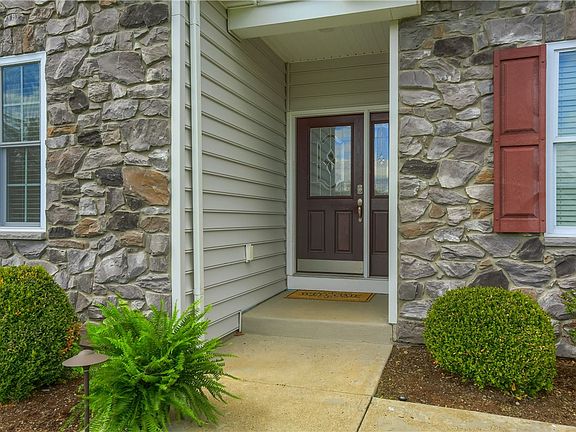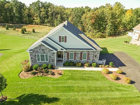 Welcome to this stunning ranch home in a unique low-maintenance 55+ community on a spacious 1/2 Acre owned homesite with private views and professional landscaping. Beveled glass door opens to hardwood floors flowing into the open-concept layout. The gourmet kitchen features tile flooring, quartzite counters, custom cabinetry, backsplash, a large island with seating, pendant lighting, and stainless appliances, opening to a hardwood dining area with chandelier. The family room boasts cathedral ceiling, a cozy fireplace, vivid windows, and surround sound. French doors lead to a screened porch, deck, and beautifully landscaped yard. The primary suite offers a trey ceiling, spa-like tiled bath with modern vanity, jetted tub and shower. A bright guest room, hall bath, & custom laundry add convenience. The finished lower level includes a guest bedroom, full bath, game room with bar, French doors to a patio, and ample storage. The garage has additional storage and huge built in cabinetry!