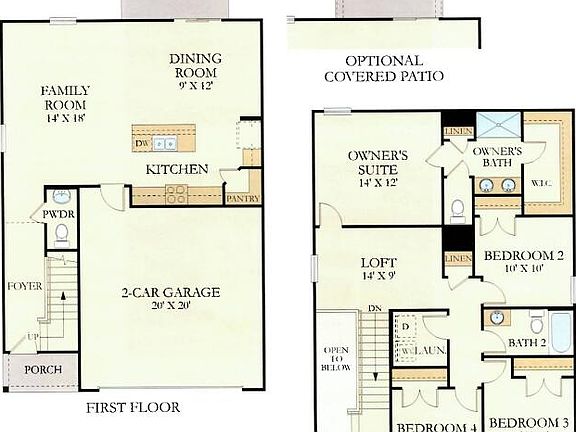 This new two-story home design combines style and convenience. The first floor features an open floorplan connecting the family room, dining room and kitchen, which has a large center island. A patio enhances outdoor enjoyment. Upstairs are a centrally situated loft, three secondary bedrooms and an owner's suite with a luxe bathroom and a large walk-in closet.