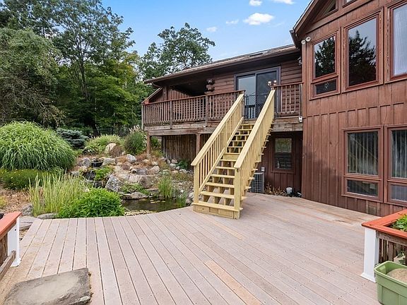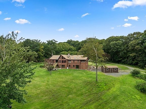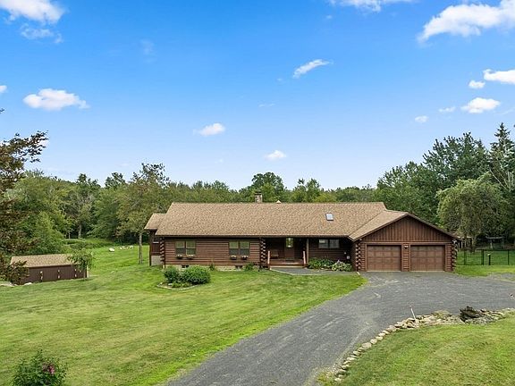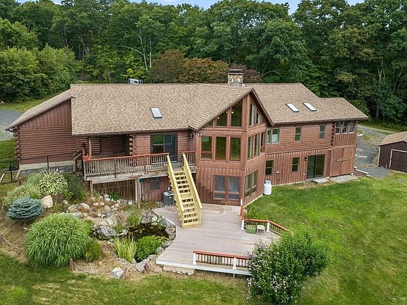 Enjoy this property with 80 acres of land including a pond, clearings, fields, brooks and trails. This 3 br 3 bath log home is made for country living. The hardwood floors have just been refinished throughout the 1st floor. Discover cathedral ceilings, floor to ceiling windows, and a splash of color. The kitchen features an 8 burner gas stove and an antique Western Holly double wall oven. The main br has 2 skylights with solar powered shades, attached bath with huge tile shower and an office space. The rooms are all large and spacious. The living room features a floor to ceiling stone fireplace. Sliders off the dining room lead to a wrap around porch with stairs down to a deck overlooking the koi pond . The lower level is finished with ship lap walls, another bedroom, full bath, den with wood stove and more. Mechanicals include 200 amp service, a Buderus boiler, new h.w. tank and double oil tanks. The grounds are magnificent. This property must be seen to be truly appreciated.