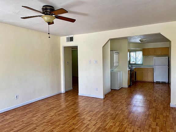 Beautiful 2 bedroom 1 bathroom apartment in a duplex conveniently located in North Nob Hill near Carlisle and Lomas! Wood floors throughout the large living room open to dining room and kitchen, two bedrooms and full bathroom with custom tile shower and additional storage. Kitchen with double sinks, gooseneck faucet, and ample cabinet space. Private fenced backyard with shade trees and shed. Driveway parking. Refrigerated AC. Appliances included: washer, dryer, refrigerator, gas stove. We do not accept applications from outside sources such as Zillow and Trulia. e-mail ETB Properties for an online application. Pets acceptable with $25 monthly pet fee per pet, with good landlord reference verifying no pet damages. No Smoking