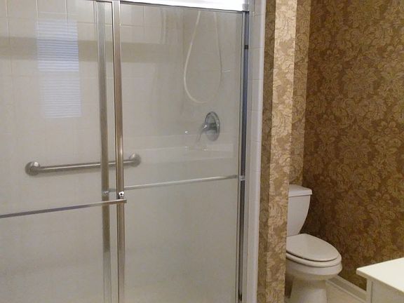 of upgraded cabinets, gas fireplace, designer wallpaper. Large walkin closet in spacious master with easy access double walk-in shower. Second bath has shower/tub combo. Second bedroom is large with double wide closet. Open floor plan has view from kitchen to separate large dining room and family room. Ceiling fans throughout. All appliances/washer, dryer included. Wide doors are handicap accessible. Attic access, 1 large car garage. All outside is maintenance free and also includes water, garbage and sewer/pool, workout room and clubhouse.