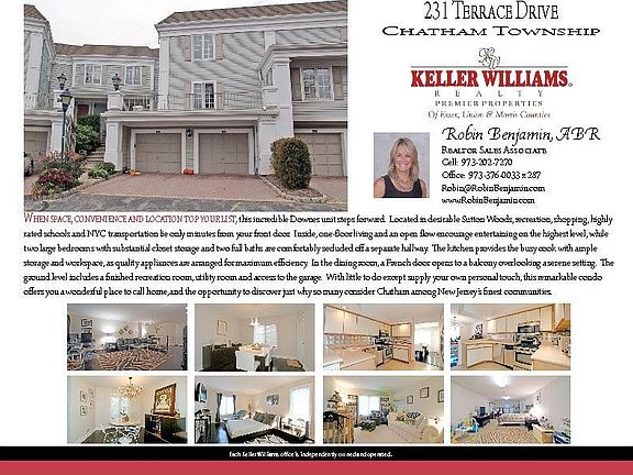 When space, convenience and location top your list, this incredible Downes unit steps forward. Located in desirable Sutton Woods, recreation, shopping, highly rated schools and NYC transportation lie only minutes from your front door. Inside, one-floor living and an open flow encourage entertaining on the highest level, while two large bedrooms with substantial closet storage and two full baths are comfortably secluded off a separate hallway. The kitchen provides the busy cook with ample storage and workspace, as quality appliances are arranged for maximum efficiency. In the dining room, a French door opens to a balcony overlooking a serene setting. The ground level includes a finished recreation room, utility room and access to the garage. With little to do except supply your own personal touch, this remarkable condo offers you a wonderful place to call home, and the opportunity to discover just why so many consider Chatham among New Jersey?s finest communities.