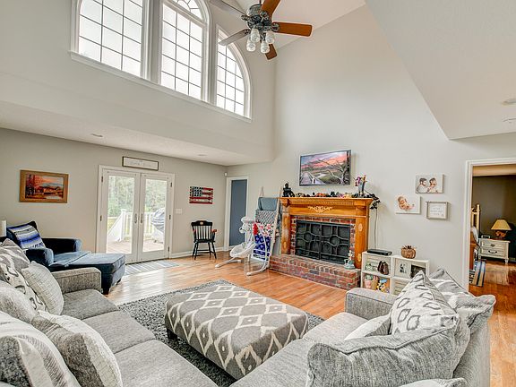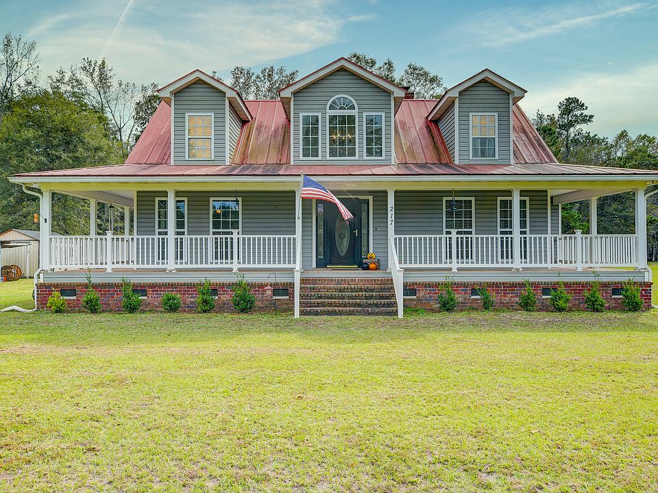 Have you been searching for a spacious home in a serene location? Do you enjoy a more rural setting that is also close to shopping, restaurants, and historic downtown Charleston? This lovely home on over six acres in Ridgeville might be just what you are seeking! The wrap-around porch offers plenty of space to kick back and enjoy the natural setting. Step inside the two-story foyer to discover wood flooring and great natural light. To the left of the foyer is the roomy dining room with French doors leading to the porch. The functional kitchen has abundant white cabinetry and countertop space. The grand, bright living room has a wood-burning fireplace, a large Palladian window, and French doors to the wrap-around porch. The main-level owner's suite has access to the wrap-around porch aswell as French doors leading to a sunroom. A barn door leads to the en-suite with a walk-in closet, dual vanities, a jetted tub, and a step-in shower. Head upstairs two find two additional bedrooms as well as a shared full bathroom. The fenced-in yard is the perfect spot to relax, grill out, or star-gaze while sitting around the new in-ground fit pit. With gorgeous, wooded views and a close proximity to I-26, shopping, and dining, this property is sure to please. Come by today!