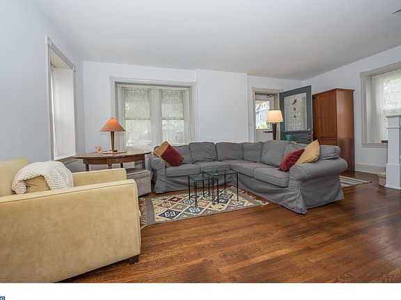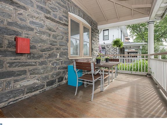 Beautiful home in Narberth. Three Floors of living space with Five Bedrooms, Two Full & One Half Bath. The large covered front porch is perfect for relaxing or entertaining while enhancing the outdoor space. The first floor has a large living room, dining room with built-ins, and an updated eat in kitchen with stainless steel appliances, ample counter space, half bath and access to the private back yard and detached one car garage. This floor has high ceilings, hardwood floors, and deep-set windows and has been professionally painted. The second floor has four Equal Size Bedrooms and an Updated Hall Bath. The Third Floor has a Bedroom, a Full bath with tub and new soil pipe and extra Attic storage Space. The basement is unfinished, housing the utilities and laundry along with plenty of storage. All Knob and Tube wiring has been removed (2017, paperwork provided), Interior professionally painted (2017), New Boiler (2015) and Kitchen Remodel(2009). There is a private driveway and a one car detached garage. Driveway and garage in 'as is' condition. All within walking distance to shopping, public transportation and close to schools and major routes.