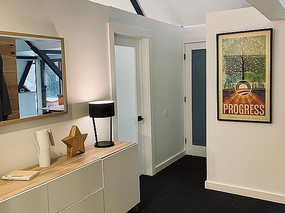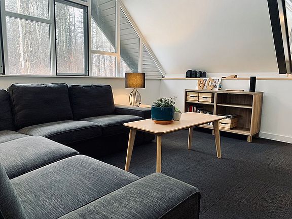 Located on a private wooded 2-acres, our two bedroom home features SMART home technology (use Siri to control lights and fans), large cathedral ceilings, expansive floor-to-ceiling windows, and unique architectural designs. The large master bedroom features a Casper King-Sized Mattress, private bath with shower, gas fired fireplace, ceiling fan and 42” LCD television. The master bedroom has easy access to the energy efficient oversized washer and dryer. The living room features a wood-burning fireplace, 60” LCD television, with access to an Apple TV, and 14 foot ceiling with fan. The dining area has seating for 6. The second bedroom is setup with two twin beds with pack and play cribs available upon request. The main bathroom is located in the living area with a large soaking tub. Our kitchen, has everything you need to make a meal for your family, but is our next renovation project. Full-sized refrigerator and dishwasher, along with an advanced super-convection counter-top oven and induction burner.