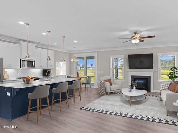 The floor plan at 217, called The Midland II, is timeless and functional, with three bedrooms and 2 full bathrooms on the primary level plus a bedroom room with a full bathroom and closet upstairs over the garage. The seamless integration of the living, dining, and kitchen areas creates a spacious and inviting atmosphere, perfect for entertaining guests or enjoying quality time at home. The primary suite with a walk in closet has a private location on the opposite side of the living areas from the two additional bedrooms, creating the perfect amount of separation. 217 Windswept includes a screened-in porch with a ceiling fan to enjoy the outdoors on warmer summer evenings! Additional special features include: a fireplace in the great room, quartz countertops, low-maintenance LVP flooring in living areas, carpet in bedrooms, and tile in the bathrooms and laundry room. Thoughtful details throughout, such as a transom with craftsman trim in the master bath and crown molding (7'' living areas and primary, 5.25'' in guest bedrooms), make all the difference. You'll love the resort life from your new construction home at 217 Windswept!