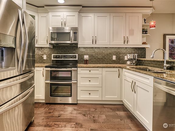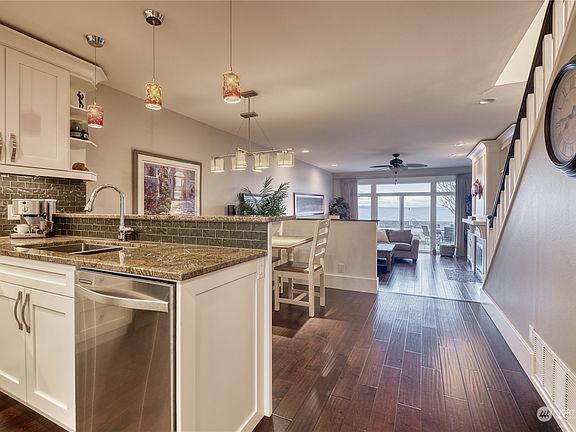 Spectacular seaside two story condo rarely offered located in the highly desired Maple Beach community. This renovated east-facing unit exhibits exceptional unobstructed views of the ocean + Mt. Baker w/ stunning upgrades. Featuring 2 beds, 2.5 baths and an open concept kitchen w/ custom millwork, and granite countertops. Beautiful engineered hardwood throughout, a bright living room w/ big views and a wood-burning fireplace. Wonderful indoor-outdoor lifestyle with two decks on the main, and a balcony off of the primary w/ ocean vistas. This complex offers shared garage storage perfect for beach toys and is located just across the road from the beach w/ sandbars for days, and warm bath water in the Summer. This is a one of a kind offering!