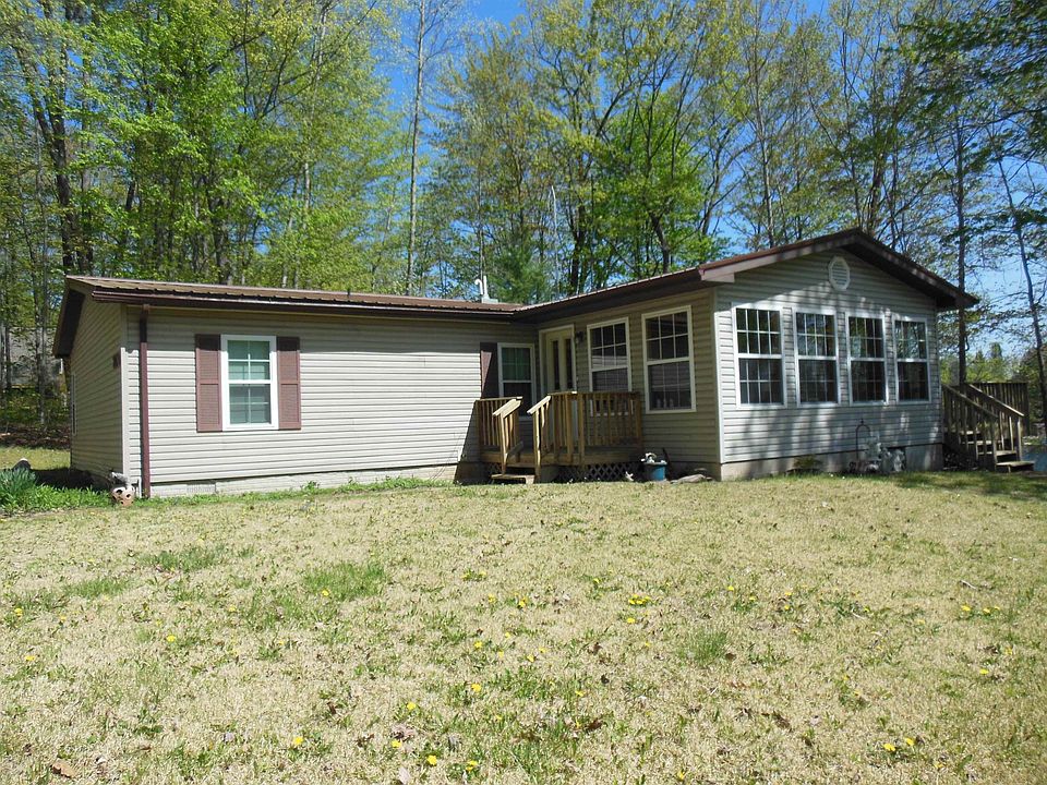 Looking for the perfect 3 bedroom 2 bath getaway cottage or year around waterfront home on a private serene setting with no close neighbors on a 1/2 acre (+) lot with 75 feet of frontage on 15-20 acre Deer Lake. (private deep, non-all sports, no wake lake.) Home has a beautiful knotty pine sunroom that was built in 2000 that overlooks the lake with a walkout sliding door onto the 11x14 deck. There has been much updating done to this manufactured home such as newer windows, metal roof, furnace, new kitchen in 2003 and both baths have just been completely redone this year, and much more. Home has utility room, kitchen with bar and pantry closet, Living room with a cathedral ceiling and a wall of windows overlooking the lake, nice laminate flooring, cement drive, a large 26x28 2 1/2 car garage with door opener, & 6x16 storage room with built-in shelving, all on a large lot in a great location not far from town and many other lakes. Must See!! Sale to include stove, refrigerator, washer, dryer, microwave, water softener, dishwasher, window air conditioners & boat dock.