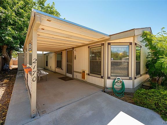 Don't pass by this beautifully maintained 18x60, 1080 sqft manufactured home with two bedrooms and two bathrooms. With no stairs and a walk-in shower in the primary bedroom, it's perfect for anyone looking for easy accessibility. As you approach the home, you'll notice all of the great concrete work in the front of the house, providing plenty of space for parking. The two attached carports are fully enclosed, with plenty of room for a vehicle, and the left side carport includes drive-through doors that allow access to the back yard. The patio area is a great place to enjoy the outdoors, with surrounding shade trees keeping you cool on hot days. The living area and kitchen are a great size and the home has built ins throughout for that extra touch. The home has central AC and dual pane windows which are sure to help in the summer and winter months. If you're looking for convenience, this home is located close to shopping, dining, and more, you'll have everything you need at your fingertips.