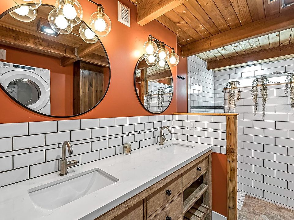 Wood-burning fireplaceCustom kitchenCustom woodworkAbundant natural lightDeep farmhouse sinkEfficient windowsHandcrafted wood cabinets