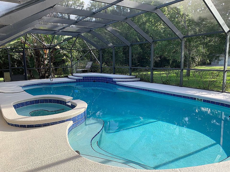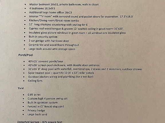 5 bedroom/3 bath single story family home with an office. Large back yard with a huge solar heated/screened pool and spa. Detached 3 car garage (875 sq feet) on a 0.85 acre lot. 3,995 total sq feet, 2595 under air. Plus 100 sq ft walk around space with finished floor in the attic