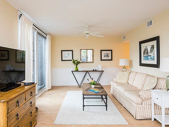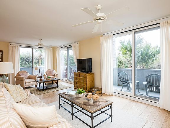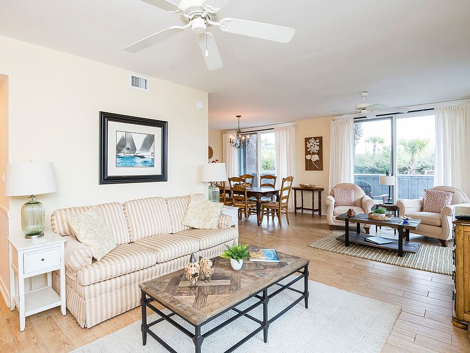 This charming, oceanfront villa has immediate proximity to the beach and a private path to the boardwalk. With an efficient, open concept plan, this villa is outfitted with coastal chic furnishings, wide-plank flooring, and three sets of sliding glass doors that open to the private wraparound porch flooding the unit with natural light. The comfortable living room is adjacent to the dining nook and offers several different seating arrangements, great beachside views, and direct access to the porch. The newly renovated, galley-style kitchen has a suite of stainless appliances, granite countertops, and ample cabinetry with glass panel accents. Two generously-sized bedrooms, each with private, updated baths, accommodate king-sized beds. One bedroom has a private balcony. An ideal rental property, this turnkey villa is being offered fully furnished.