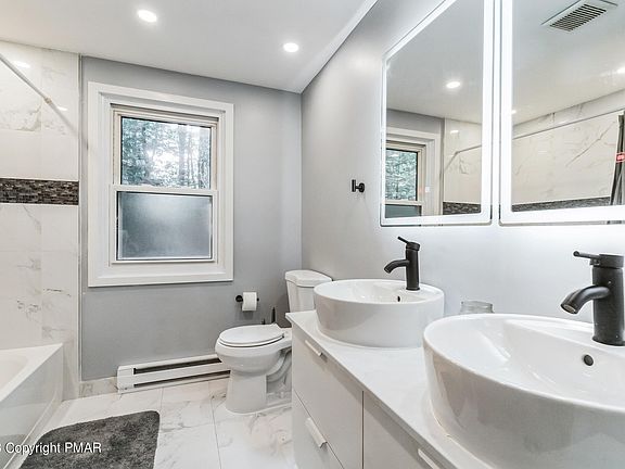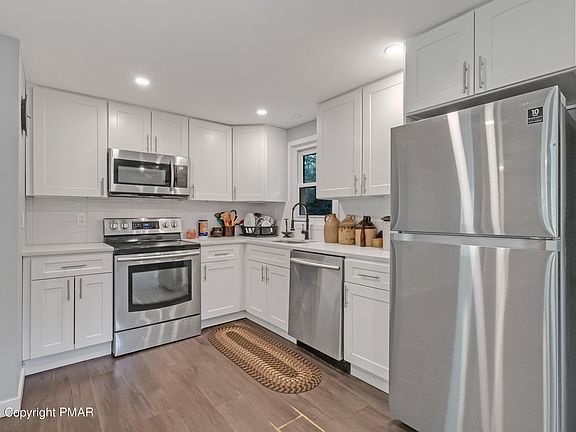 Come see this Beautiful, 4 bed 2 Bath Cape Cod style home near the Heart of the Poconos. Located within a Private Lake Community, within walking distance of two lakes. Recently renovated with Newer Roof, Windows and Siding, Front Porch, and Back Deck. The main floor has 3 bedrooms along with stackable washer and dryer. The kitchen has attractive quartz countertops accented with stainless steel appliances. Main bathroom features double vanity with modern sinks, touch light mirrors, Marble tile in tub/shower and floor. The second floor has an open layout family room, as well as the Master Bedroom with its own bathroom. shopping centers and Casino, just minutes from I-380 for a convenient commute! Grab your Forever Home or investment property Now! STR friendly