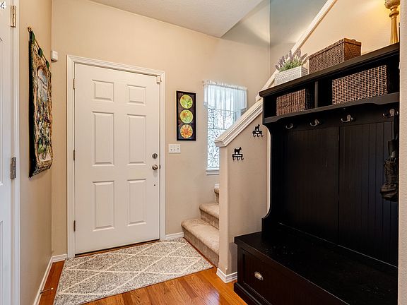 Absolutely beautiful move-in ready end-unit townhouse. This home features an open-format living space which allows natural light to permeate throughout and is bright and inviting. Hardwood floors downstairs lead into dining area, living room, and tile-floor kitchen. The quartz kitchen countertops are accented by the stainless-steel French-door refrigerator, which is included, gas convection oven, low-noise dishwasher, and built-in microwave. The living room with the gas fireplace creates a cozy ambience, a perfect place for those that want to entertain and watch the big game. The space is still quaint enough for those that want to enjoy a meal at the table or for kitchen-island eating interacting with a cook performing their craft. As one goes upstairs on the freshly cleaned carpets, the top landing offers a perfect spot to curl up with a book or to work from a home office and watch a sunset on chilly days. This home feels big with 9' ceilings on both floors. The primary bedroom has a large recessed section in the ceiling complimented with dual full-size closets toward the ensuite bathroom. Additional features of this home include an upstairs utility room, with front-loading washer and dryer, both included. There are ceiling fans to supplement the forced air furnace with AC. In the garage is room for storage or to allow one to stock up on groceries with the stand-up freezer, which is included. Tankless water heater installed. The HOA takes care of the front and a new fence was installed in 2023 for the side and back yard. Enjoy every sunset from the manicured backyard with built-in fire pit and deck. Want to enjoy the outdoors but not go far? If the backyard space isn't enough, access the Cedar Creek Trailhead adjacent to the home which winds to the Stella Olson Memorial Park. The exterior was updated in 2023 with a new roof, new gutters, and new exterior paint. The only thing left to do is to call it home! Call for a showing today!