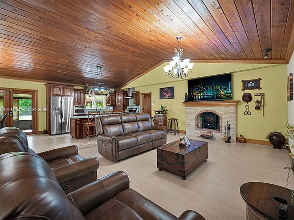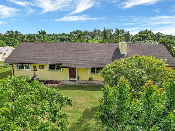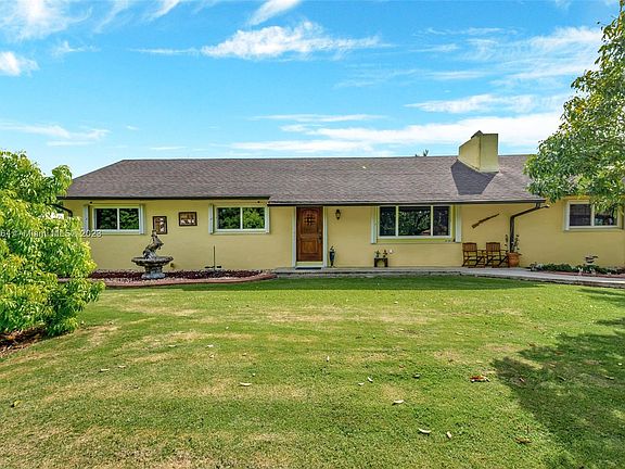 Agriculturally exempt 3/2 ranch home features large bedrooms and renovated baths, travertine marble Floors throughout, crown molding, fireplace, vaulted ceilings in the living room with beautifully finished Tongue & Groove paneling, custom kitchen cabinets, granite countertops, stainless steel appliances, reverse osmosis water filtration, impact windows and hurricane accordion shutters, security system with cameras. Screened back porch with a Jacuzzi and a sauna with plenty of space perfect for large gatherings. Oversized two car garage plus a two car carport. Fully fenced and private with 46 fruit trees (leeches, mamey, mango, avocado and many more). 6 station programmable sprinkler system and 3 sheds. Just minutes away from Krome Ave.
