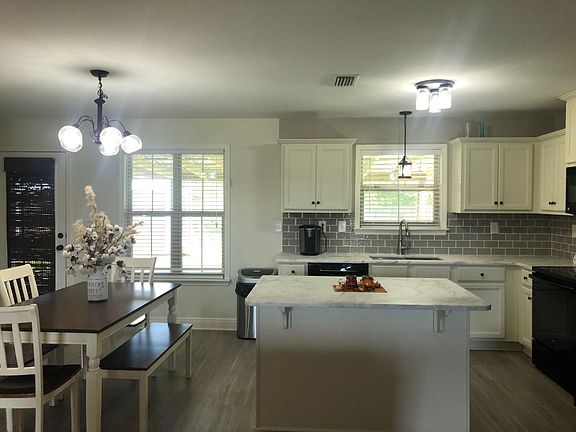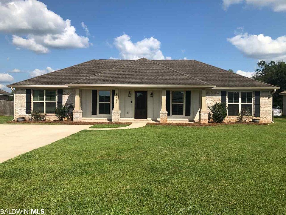 Welcome Home to this 4/2 split floor plan with an open concept located in Shadowbrook Subdivision in the heart of Robertsdale. As you enter the home you will notice the high vaulted ceilings which opens to the living room, kitchen and dining area. The kitchen has beautiful white cabinets with marble countertops and gray subway tile as a back splash and an island overlooking the living room. The living room has new flooring. The spacious master suite, highlights a full bath with an oversized soaker tub, separate shower, double vanities and walk in closet. Outside you find a beautiful landscaped yard with a covered patio that is great for entertaining. An attached storage room and a completely fenced back yard with a detached storage building/workshop that will convey with the home. Call today for your exclusive showing. This home won't last long!